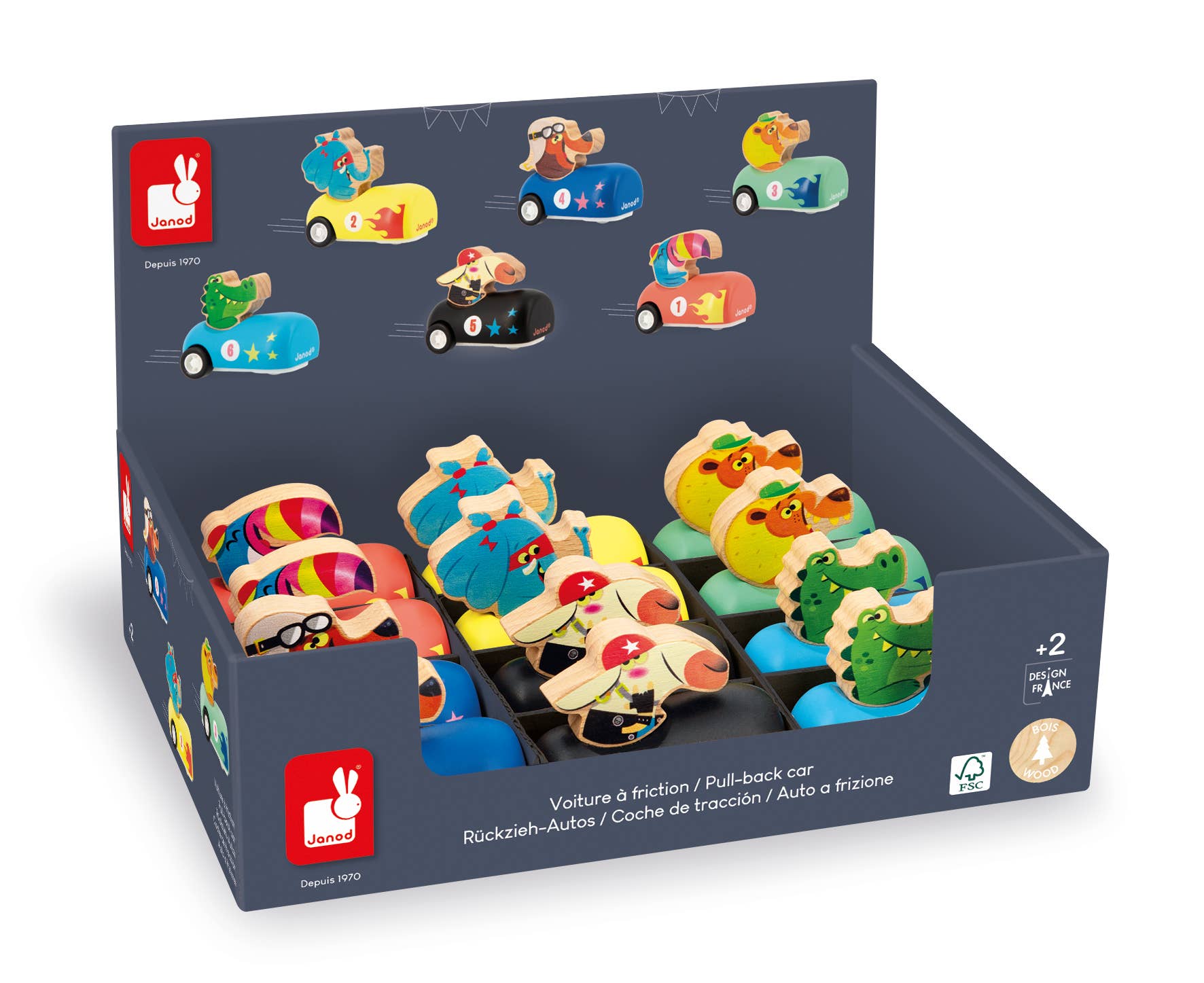Super cool pullback cars! Simply pull back the car and then let go to see it zoom off like a real racing car! Once released, the vehicle will move in all directions, thanks to the ball situated at the front of the vehicle. Each model boasts a fun and colorful driver. Choose from: 6 different models. Collect them all! For children aged 2 years and over. Assortment of 12 friction cars: 6 models with a number and different pattern printed on the hood. Sold in a display box with a label attached to each individual item.