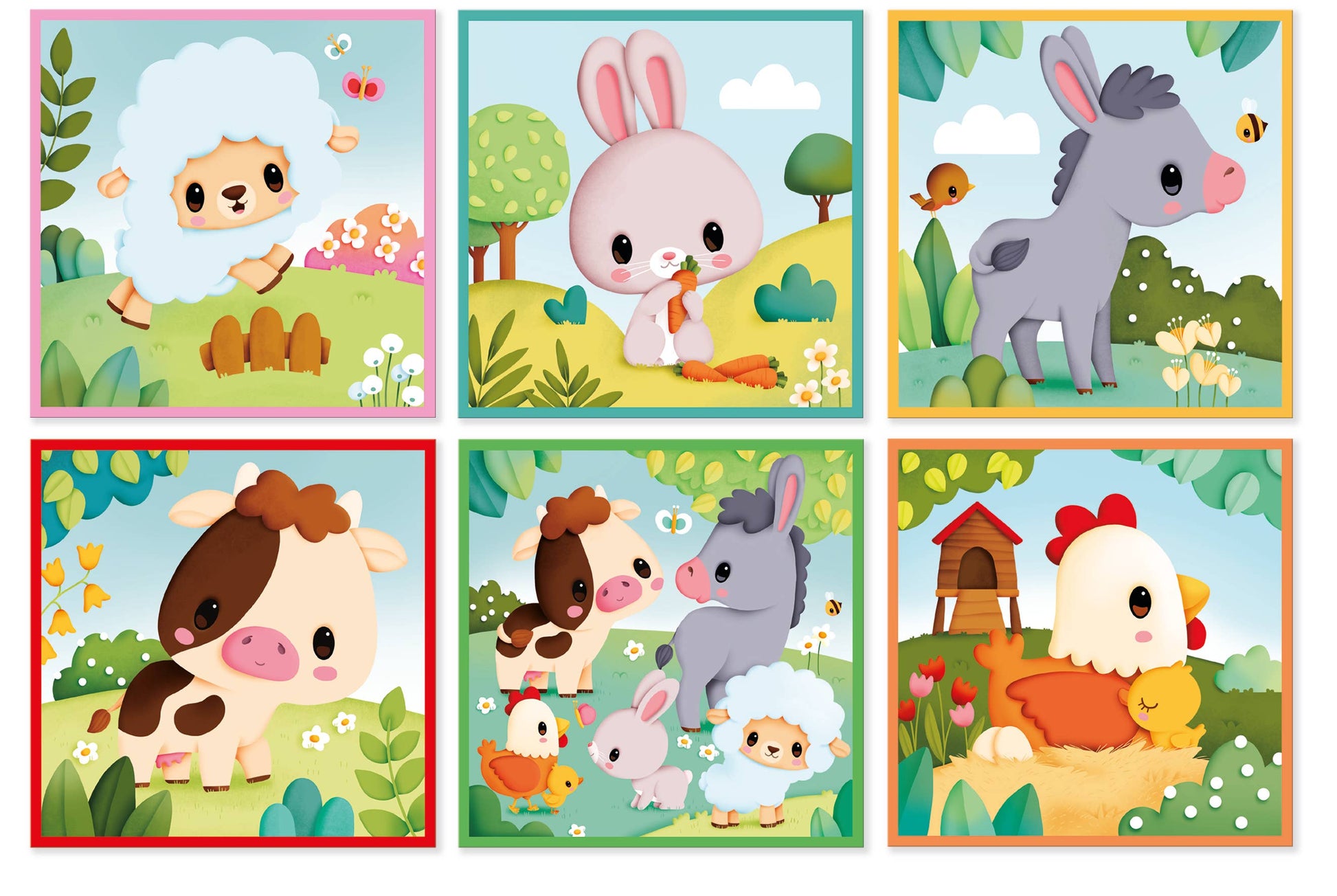 Come along to the farm and discover all the cute animals! Here are 9 cardboard cubes to create 6 scenes on the theme of farm animals: a sheep, a rabbit, a donkey, a cow, a hen with her chick and all the animals together. A colored border, different for each puzzle, is a valuable aid for children. Lightweight cubes that are easy to handle, perfect for developing the fine motor skills of little ones and the imagination of older children. For children aged 2 and over