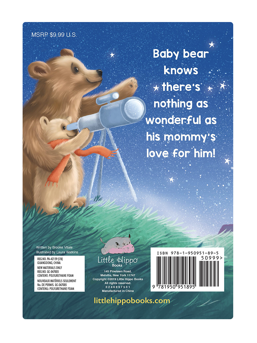 Baby bear knows there's nothing as wonderful as his mommy's love for him! Follow along as he describes all the reasons he loves his mommy. Written by Brooke Vitale and illustrated by Laura Watkins. Book Details * 6.25” x 8.25” Padded Board Book * 24 Pages * Recommended for ages: 1 - 5 * Glossy Cover * ISBN: 9781950951895