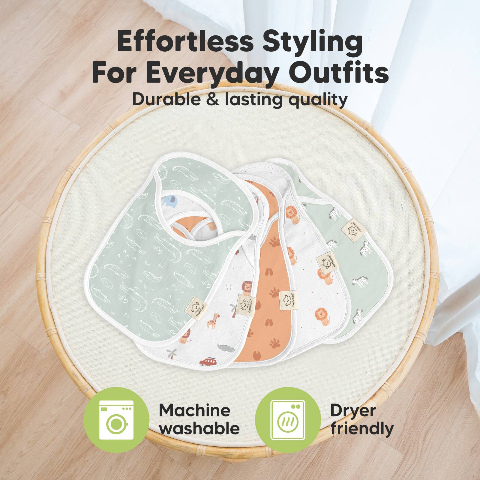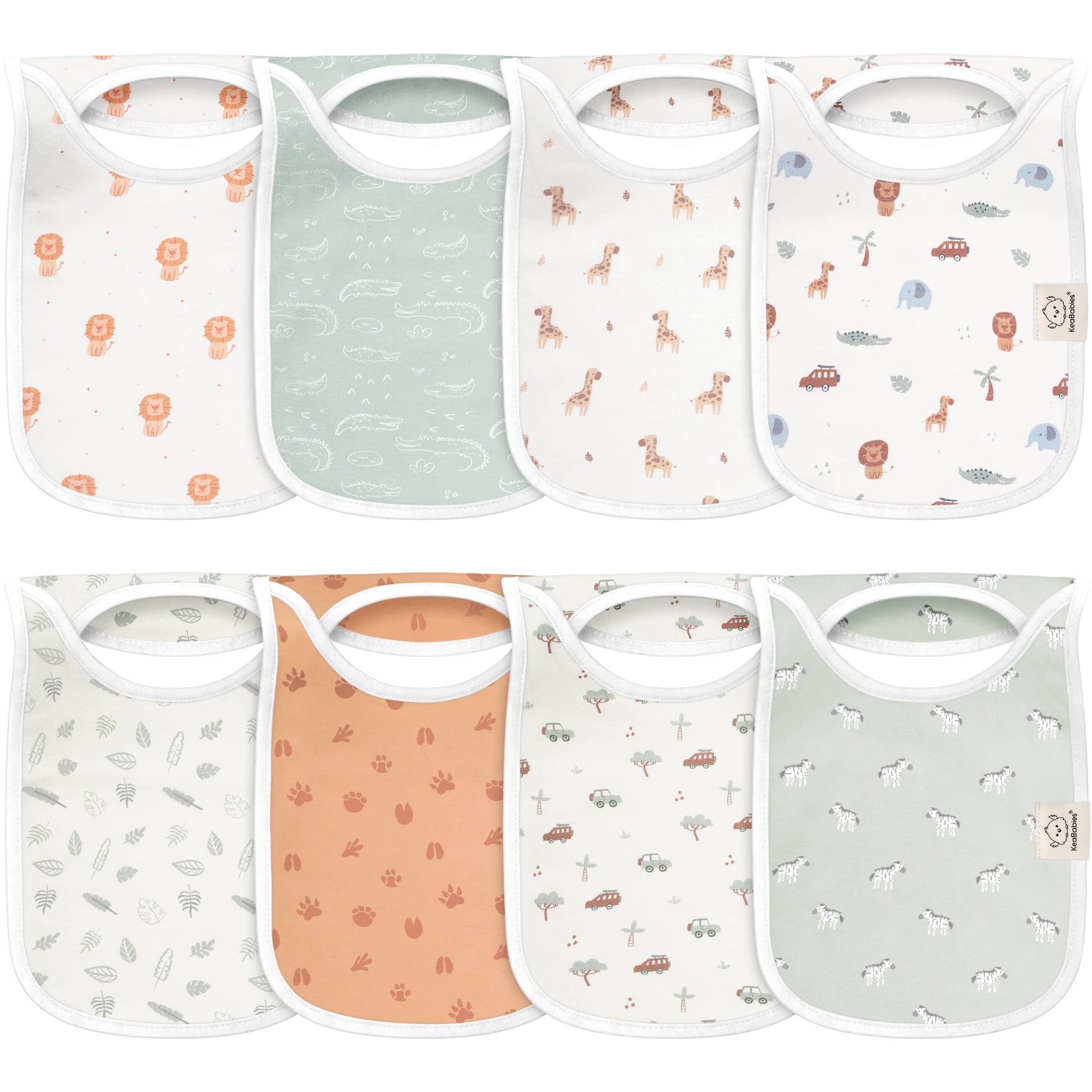 - 8-pack contemporarily stylish baby bibs that pair well with any outfit.
