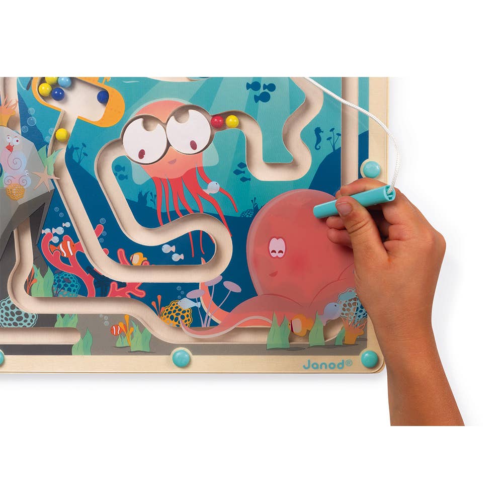 Starting from the ocean’s surface, cross the maze and bring the 16 beads into the submarine using the magnetic stylus. But it will take skill to overcome the route’s pitfalls: the octopus’ eyes that spin in all directions, secret passages... and watch out for the octopus’ eyes that move in unexpected ways when the bead passes! Heat transfer printing. Closed color box with hook