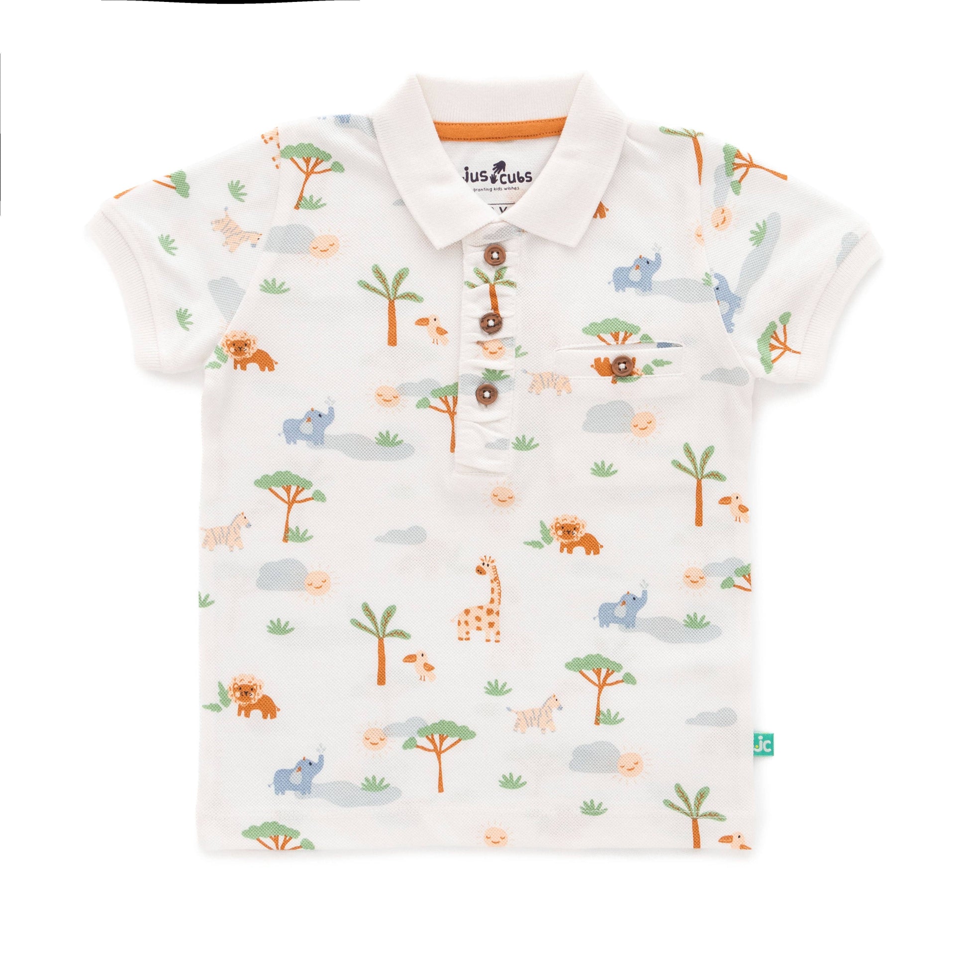 ✔ Safari Print Polo Shirt – A white short-sleeve polo featuring a playful safari animal print, a contrast white collar, and wooden button detailing for a timeless look.