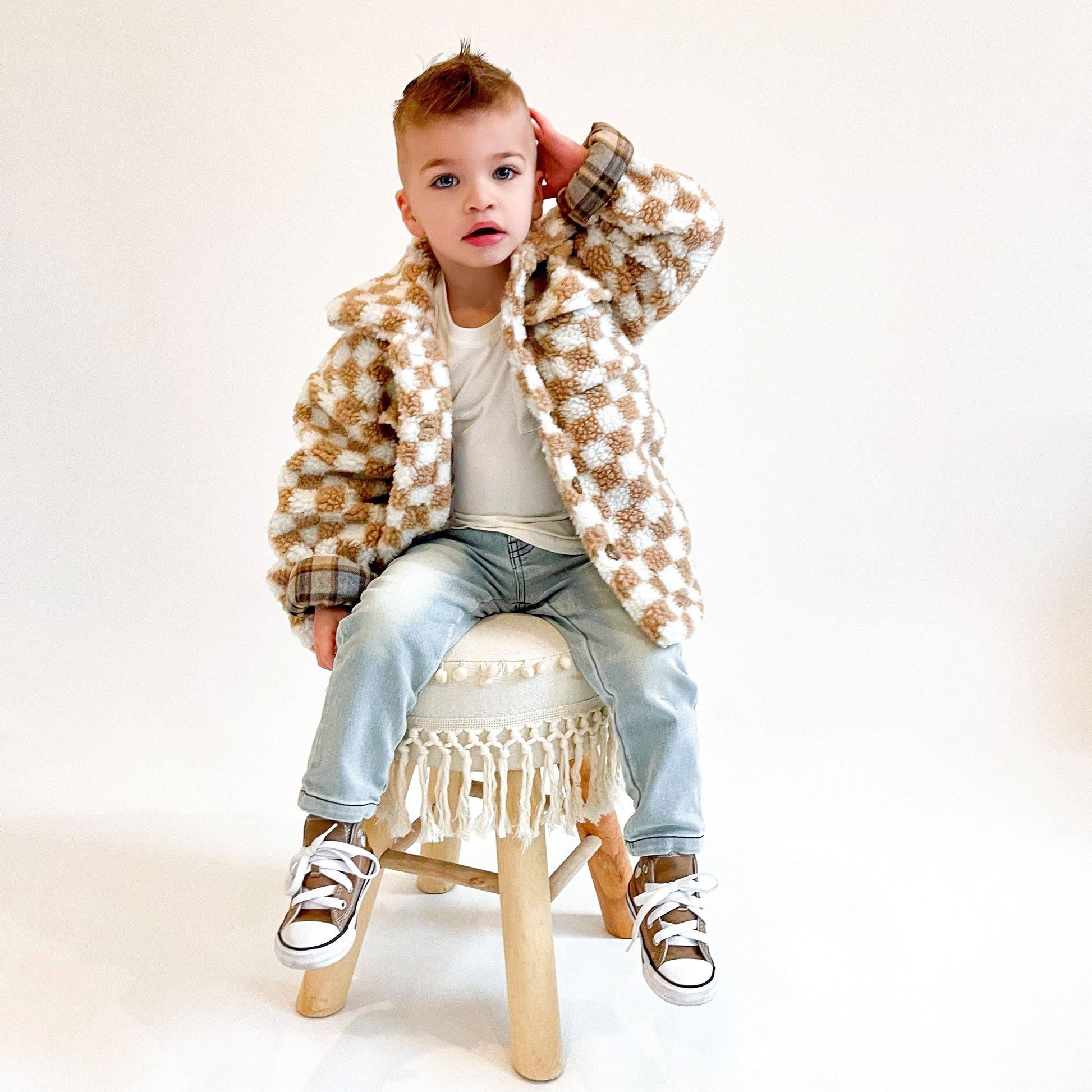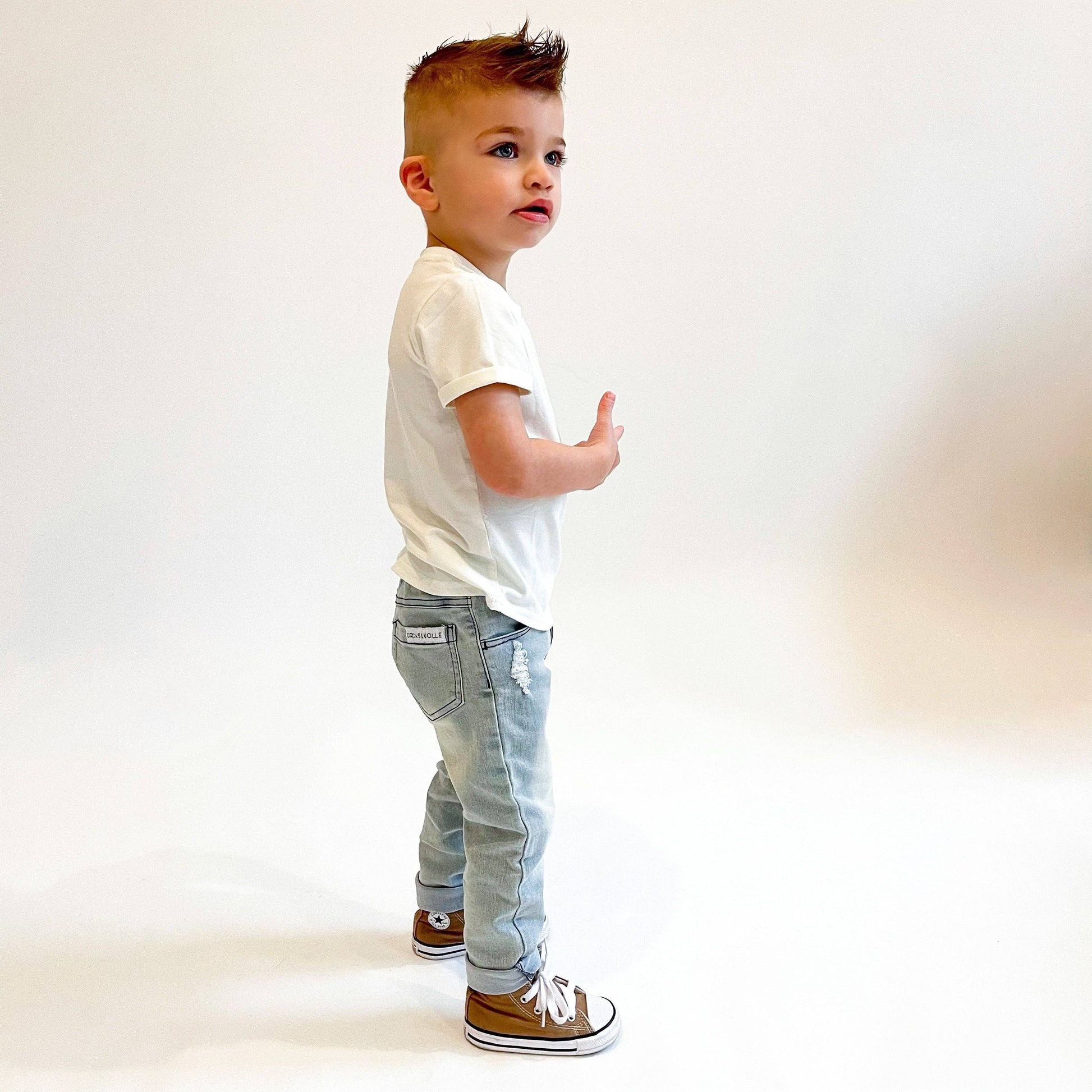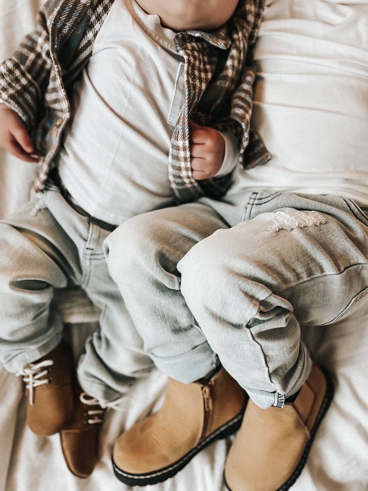 The ultimate comfy denim for your little boys and girls. Soft Denim with stretch * Elastic on back waistband * Button snap closure * Sizes 0/6M - 4/5 have sewn closed fly, sizes 5/6 and 6/7 have zipper * 73% cotton, 25% polyester, 2% spandex Sizing: True to size, we recommend ordering your child’s current size. Carter is about 43lbs, 44” tall and wearing size 4/5 with some room to grow. Cash is about 29lbs, 37” tall and wearing size 2T with some room to grow.