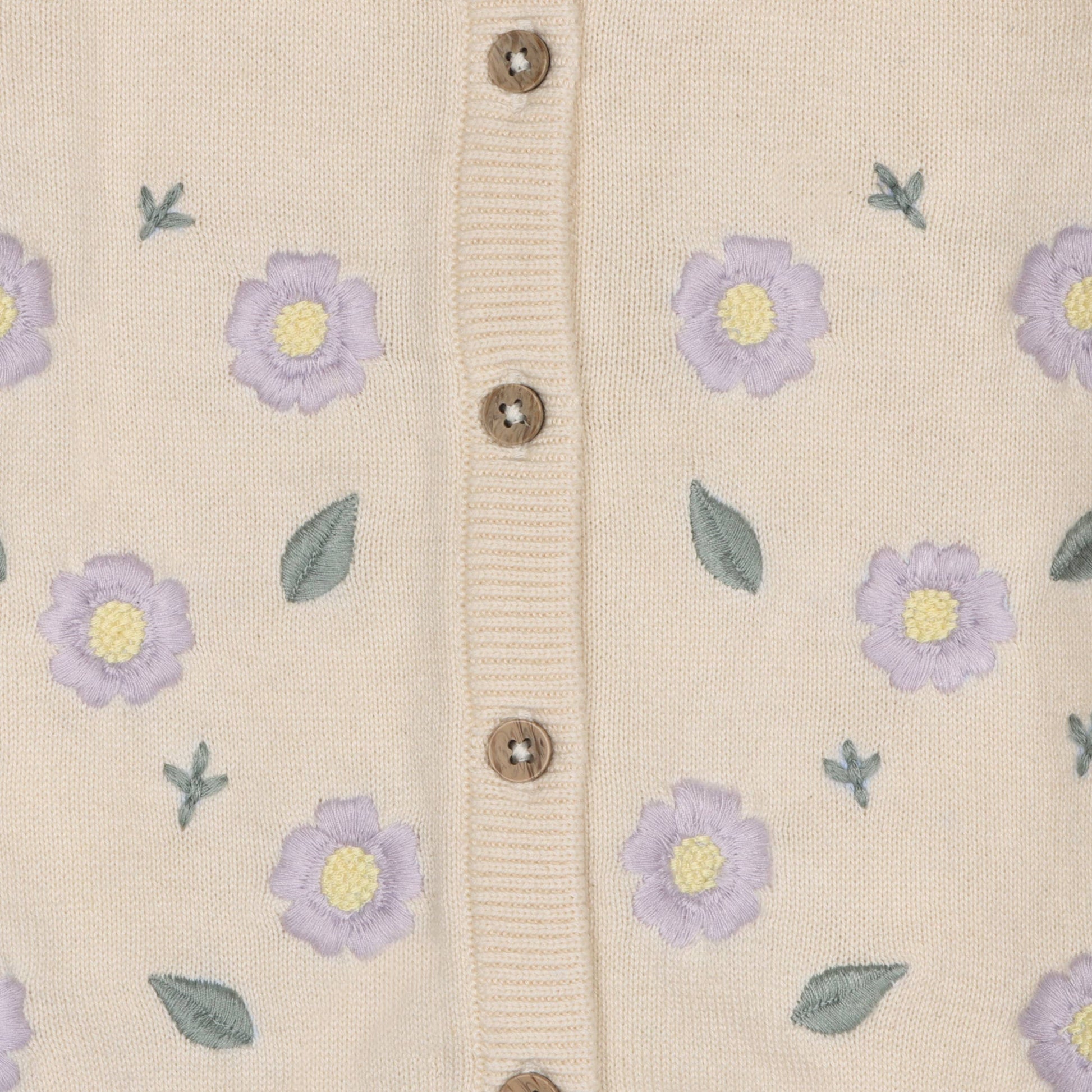 100% organic cotton sweater knit baby girl cardigan with delicate floral embroidery & Pointelle trim around the collar.