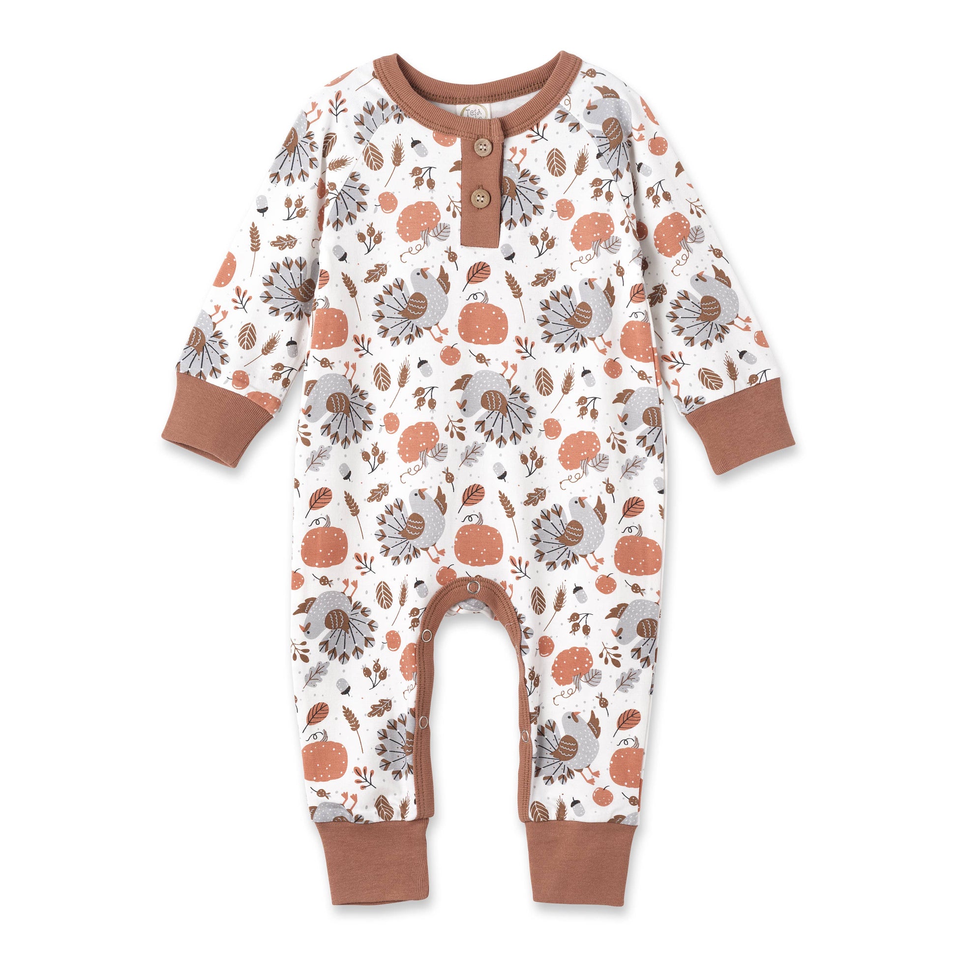 Soft Henley romper made of bamboo/cotton/spandex blend jersey. Baby will look cute and feel comfy in our absorbent, hypoallergenic, and eco-friendly style. Buttons in front and snaps underneath for easy on and off. Wash Warm. Tumble Dry Low.