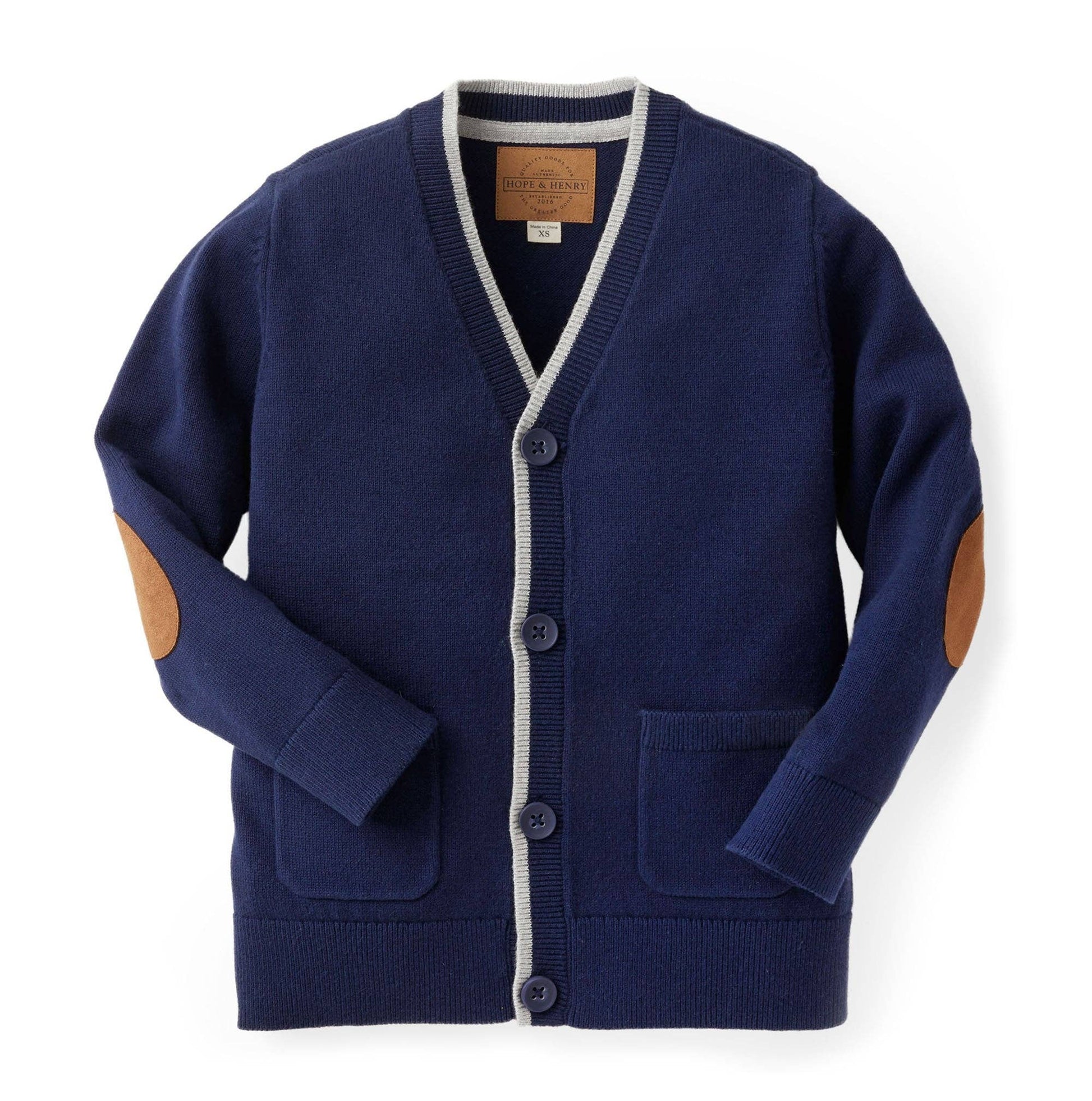 Our handsome vintage-inspired cardigan is a new version of a timeless classic. Knit in our signature soft organic cotton, it features a button front closure, contrast tipping along the rib trim, faux suede elbow patches, and two front pockets for keeping hands warm and cozy.